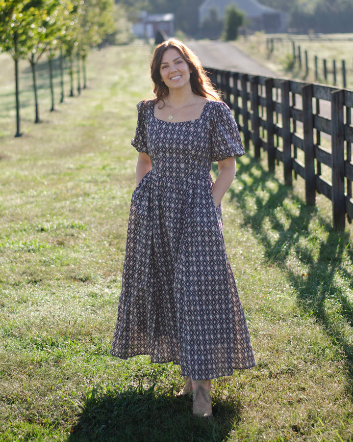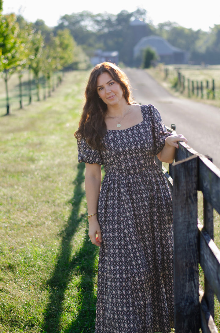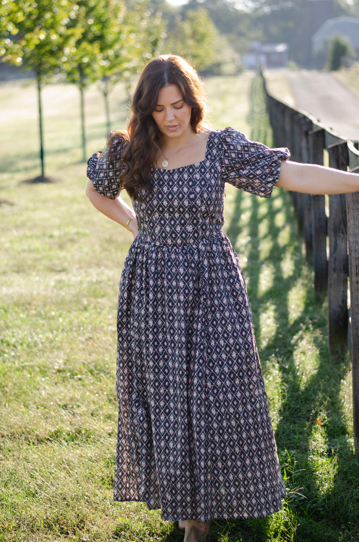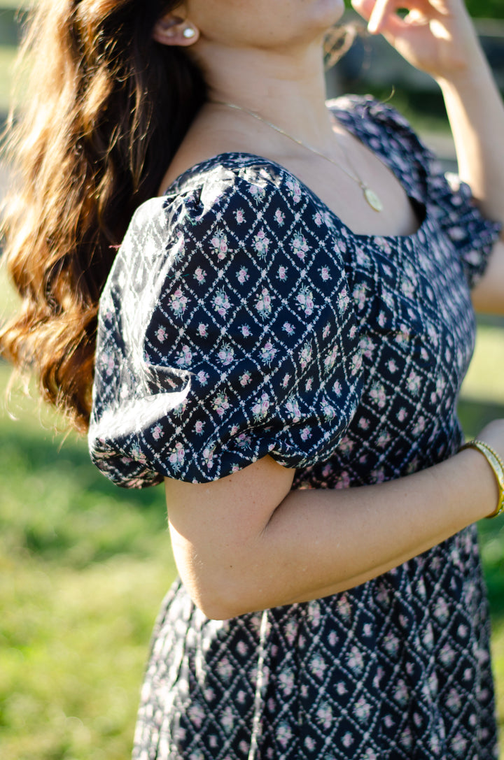 The Fiona Dress — simple, sweet, and so easy to fall in love with. Made from cotton in a gentle black hue, it’s scattered with tiny trellis and pink rose bouquets that feel straight from a garden daydream. The puff sleeves add a touch of charm, while the smocked back creates a flattering, easy fit.